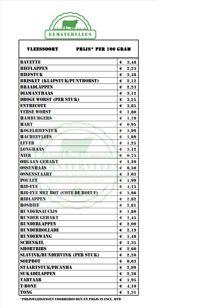 Wilt u op een ander tijdstip langskomen of bestellen? Neem dan even contact met ons op en geef uw bestelling door via info@eemstervlees.nl of 06-20455380, We publiceren ook op facebook en google extra openingstijden.